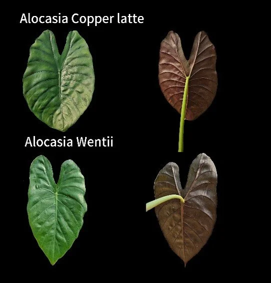 Alocasia ‘Copper Latte’ has rounded dark green, metallic leaves, which are thick and firm, distinct raised veins and burgundy-red abaxials. Similar to Alocasia ‘Uhinkii’ it is reported to be relatively drought-tolerant.