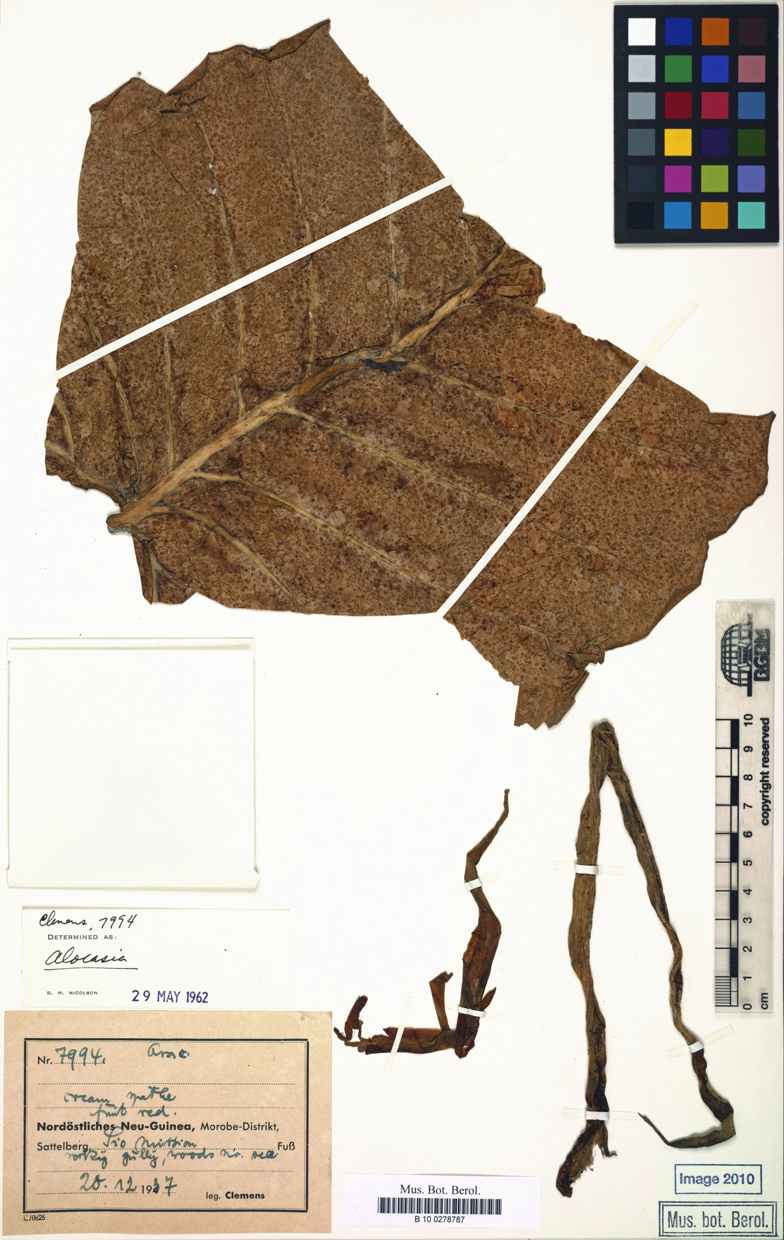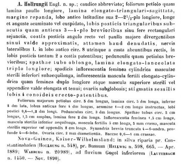 NOTES: There may be some regional variation, but it is not yet well enough understood for nomenclatural recognition to be useful. Generally the plants in Morobe Province are less robust than elsewhere and occur commonly in rainforest undergrowth. In other parts of the range the plants are often more robust and tend to occur in more open sites. Reddish colouration in the spathe occurs towards the western end of the range, mixed in populations with pale spathes. Likewise, bronze and reddish pink coloration in the petiole and major venation occurs mixed in populations with pale green petioles and veins. Occasional individualshave blackish purple petioles and veins and green laminas, similar to some cultivars of A. macrorrhizos. The two figures cited above in Burnett (I.e.) represent the extremes of form within the species. The peduncle declinate after anthesis is highly characteristic. The spathe limb persists for some considerable time after anthesis, eventually rotting and falling away shortly before the lower part dehisces.