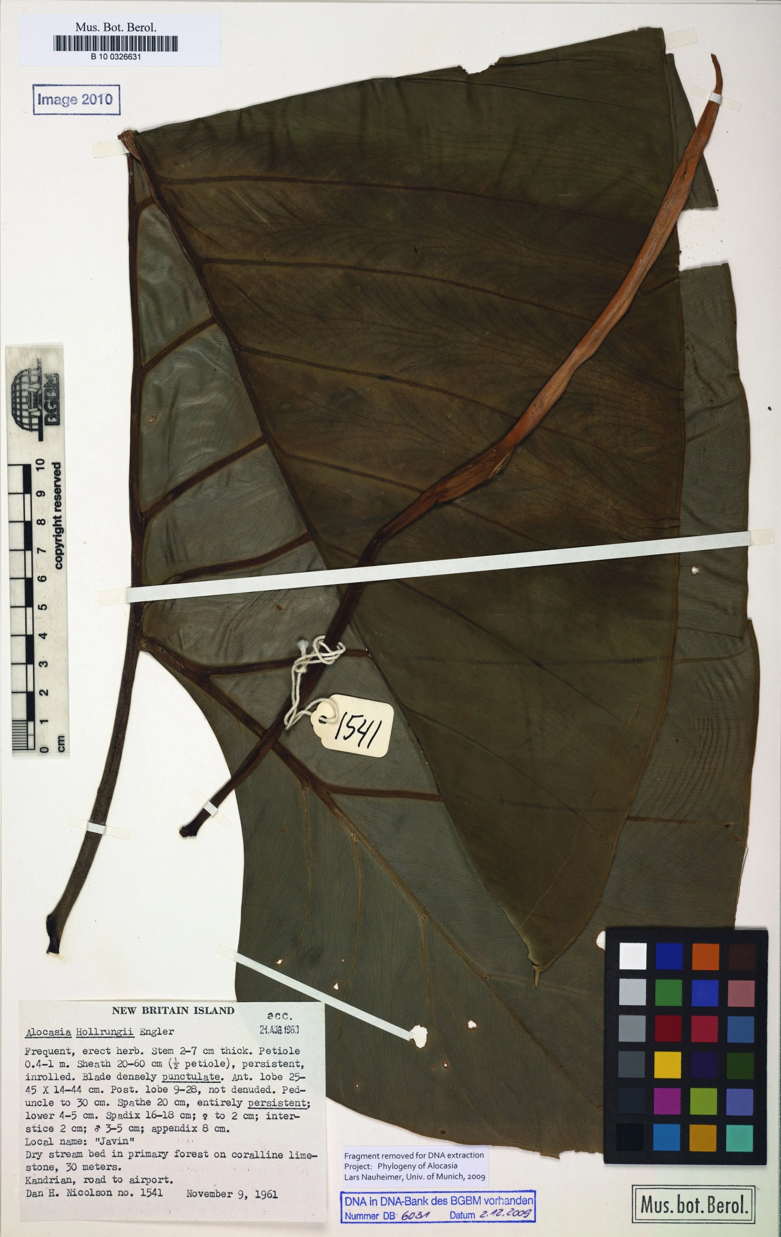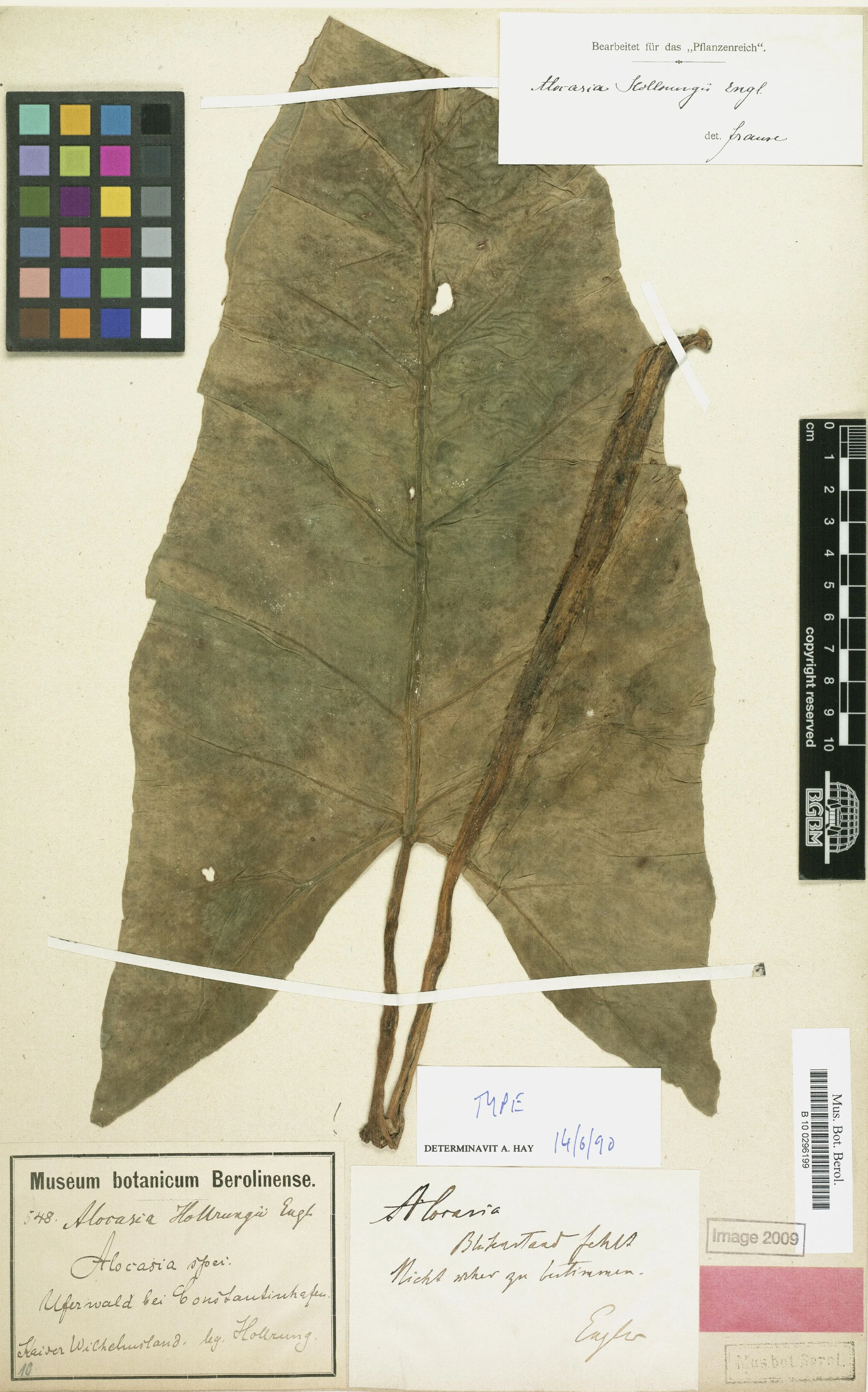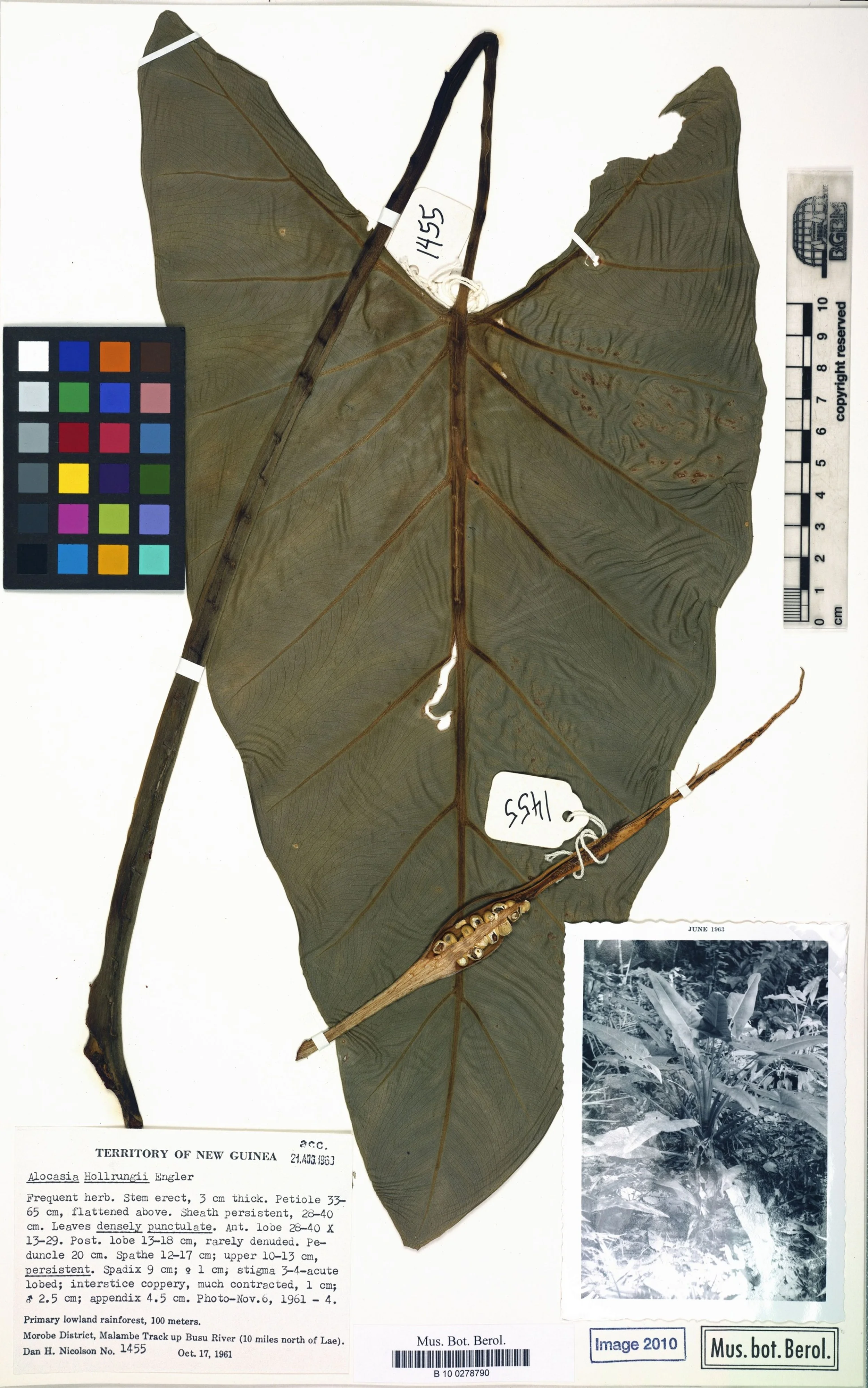 Hay has tentatively ascribed a specimen from each of Gulf and Western Provinces of Papua New Guinea to this species. The material is fragmentary, however. Alocasia hollrungii is otherwise not recorded south of the cordillera