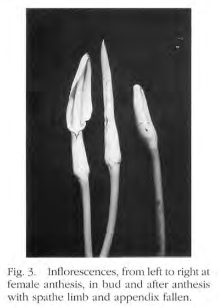 Inflorescences clustered in the center of the leaf crown, up to 26 together; peduncle greenish, hairy, ca. 30 cm long, 1 cm diam., thickening slightly in fruit, erect, sometimes somewhat curved (but not declinate) after anthesis. Spathe ca. 17 cm long, somewhat constricted level with upper part of male zone of the spadix; lower spathe very elongate, somewhat cylindric, convolute, ca. 6 cm long, ivory with scattered reddish-purple spots concentrated near the junction of spathe and peduncle; limb boat-shaped, ca. 11 cm long, ivory, with the margins reddish-purple at the base only, greenish at tip, erect then fully reflexed at anthesis. Spadix terete, subcylindric, attenuate at the tip, slightly shorter than spathe, stipe ca. 2 mm; female zone ca. 2.5 cm long, ca. 1 cm diam.; pistils closely packed ; ovary sub-globose, yellowish-green, ca 0.2 mm long, unilocular, 3-5 ovules, with basal placenta ; style terete, ivory, 1-1.5 mm long; stigma yellowish, turning red purple in spirit, 2- 3-lobed , lobes rounded; sterile zone ca . 4 mm long, ca. 8 mm in diam., creamy, slightly narrower than the fertile zones; synandrodia in ca . 2 whorls, somewhat rounded to hexagonal, more or less flat-topped , ca. 1.5- 2 111m in diam.; male zone whitish, ca . 4 cm long, ca. 1 cm in diam. , terete, almost completely contained within the lower spathe chamber; synandria rhombo-hexagonal, 1. 5-2 mm in diam. ; thecae opening through apical pores not overtopped by synconnective; synconnective somewhat impressed; appendix pale orange, about as thick as male zone, slightly over half the length of the whole spadix, tapering to a pointed tip. Fruiting peduncle to ca. 40 cm long, erect; fruiting spathe ca . 9 cm long, ovoid , white with scattered elliptic horizontally aligned flecks, basipetally dehiscent and revolute revealing bright red berries (Fig. 1)