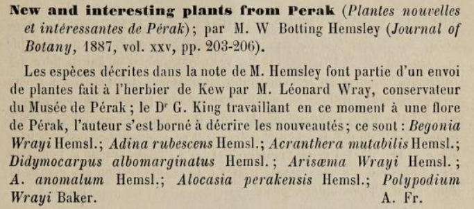 Other specimens seen: PENINSULAR MALAYSIA: Pahang, Cameron Highlands, Batten Pool s.n. (SING); Perak, Larut, trail from Bk. Larut to G. Hijau, Boyce 681 (K, KEP); Perak, G. Hijau, Burkill & Haniff 12769 (SING); Negeri Sembilan, Ladang Gadis, Carrick 692 (SING); Selangor, along old abandoned rd to Genting Highlands, Croat 53321 (K); Perak, Genting Highlands, Croat 53338 (K); Perak, G. Hijau, Mohd. Haniff & Mohd. Nur 2350 (K, SING); Cult. RBG Sydney Acc. No. 940347 ex Pahang, Bukit Eraser, Hay et al. 9280 (NSW); Pahang, No. 5 Camp, Cameron Highlands, Henderson FMSM 11666 (BO); Perak, Larut Hill, Thaiping, Long 6 (K); Selangor, top of Eraser's Hill, along path from Red Cross to Wray's Cottage, Nicolson 1175 (US), 1178 (US); Pahang, Cameron Highlands, along S path to G. Beremban, Nicolson 1194, 1201 (both SING, US); Pahang, Eraser's Hill, Mohd. Nur 10548 (SING); Pahang, Boh Plantation, Cameron Highlands, Mohd. Nur s.n. (SING); Pahang, Eraser's Hill, below Methodist Mission, Purseglove P.4283 (GH, K, L, SING); Pahang, Kuala Teku, Ridley s.n. (K); Perak, Scortechini s.n. (K, SING); Perak, Maxwell's Hill, path to G. Hijau, Mohd. Shah & Sidek 1071 (K, SING); Kelantan, G. Stong, Symington 37727 (KEP).