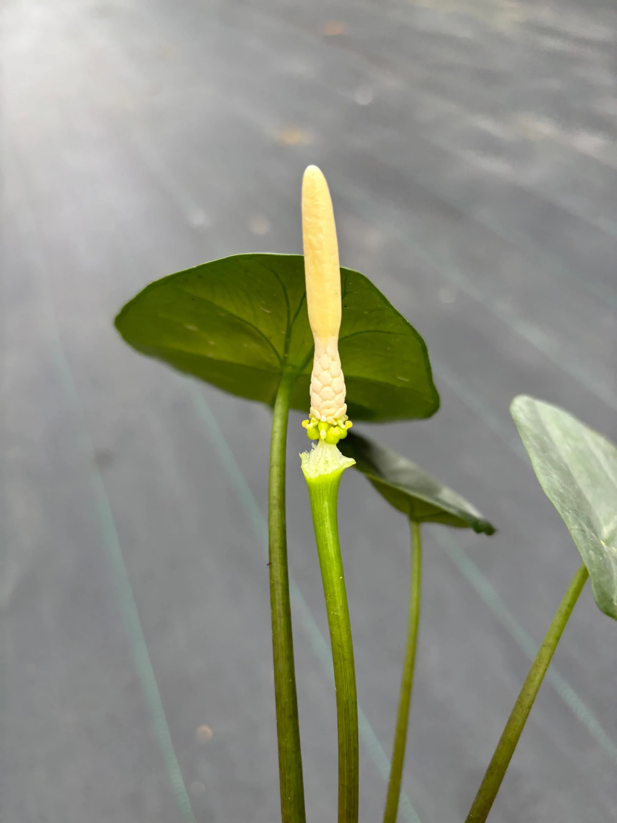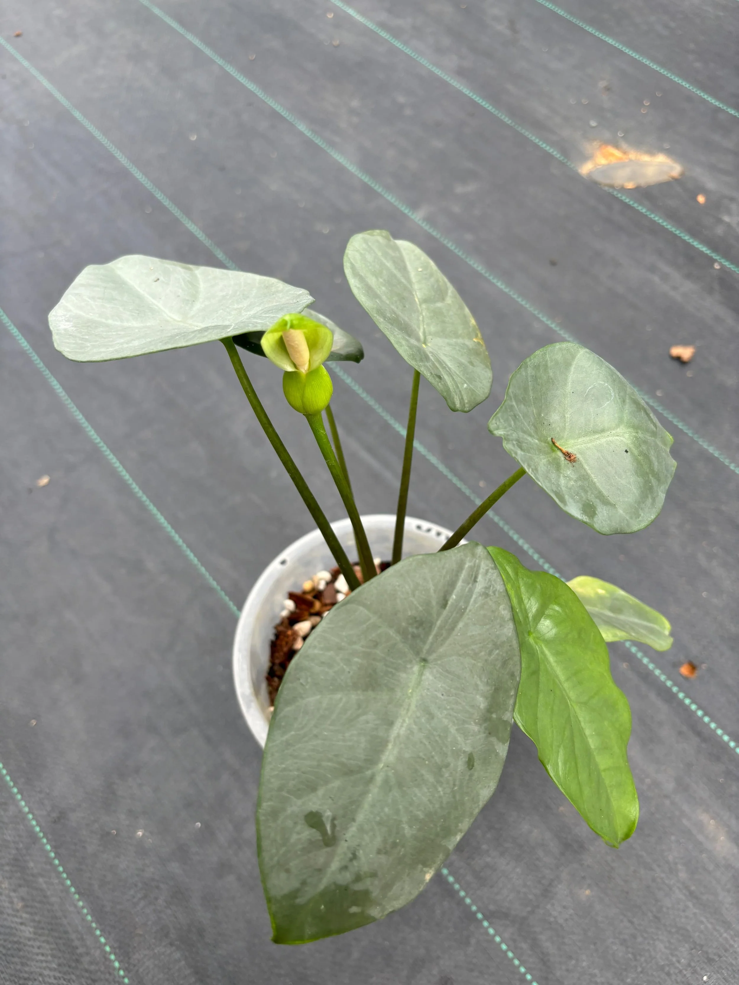 Inflorescence solitary to paired; peduncle about half to subequalling the length of the petioles; spathe greenish yellow to white, ca. 6 cm long; lower spathe ovoid, ca. 3 cm long; limb narrowly ovate, at first erect, then reflexed; spadix shorter than spathe, ca. 5 cm long, stipitate for 4 mm; female zone ca. 7 mm long; pistils few - ca. 15, rather large - ca. 4 mm long; ovary globose, 2.5 mm diam.; style 1.5 mm long; stigma prominently 2-3-lobed; sterile interstice ca. 2.5 mm long, a single whorl of synandrodia; male zone 1.5 cm long, entirely within and filling the upper half of the lower spathe chamber, conic - ca. 8 mm diam. at base narrowing to 5 mm at apex corresponding with spathe constriction; synandria relatively large - 4 mm diam., more or less hexagonal, 3-5-merous; thecae opening by apical pores not overtopped by synconnective; appendix narrowly cylindric, ca. 2.5 cm long, 4 mm diam., deeply grooved, white to yellowish; fruiting peduncle subequalling the petioles; fruiting spathe ovoid, ca. 4 cm long, the spathe dehiscing longitudinally; berries bright red.
