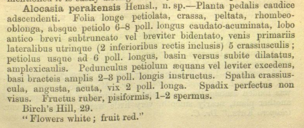 Although Alocasia perakensis has not been accepted as an entity distinct from A. beccarii by any author since its first description, they are readily distinguishable, though evidently closely related, allopatric species. Alocasia perakensis is on the whole much more robust, the leaves are generally more leathery - sometimes almost succulent, and the connate posterior lobes are cuneate rather than attenuate, the stem is more elongate, the bracts between the leaves are less frequent, the inflorescence, though structurally very similar to that of A. beccarii, is about twice the size, and the spathe is greenish yellow to whitish. With the exception of two high altitude collections from Mt Kinabalu (Sabah), doubtfully attributed here to A. beccarii, it has a higher altitudinal range than that species.