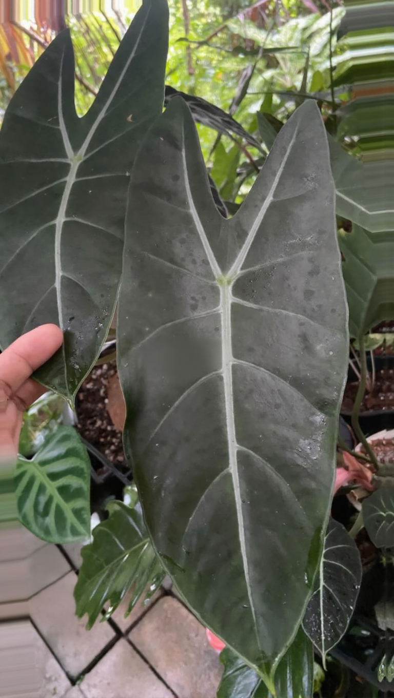 Alocasia longiloba ‘Black Satun’ x Alocasia ‘Aurora’