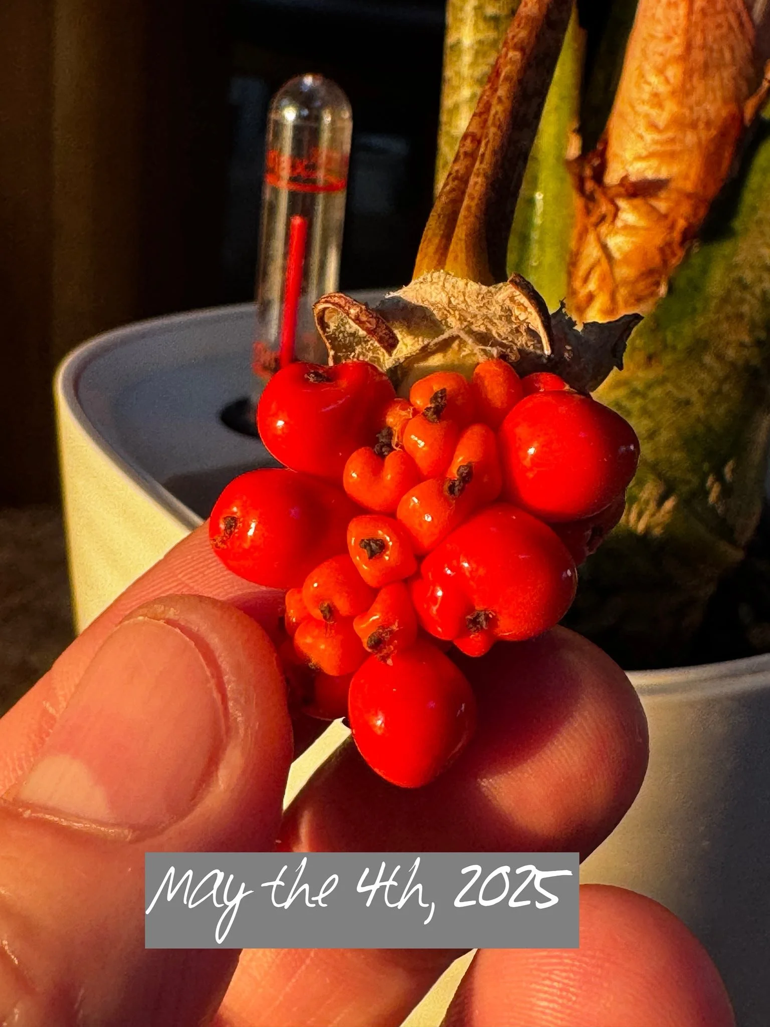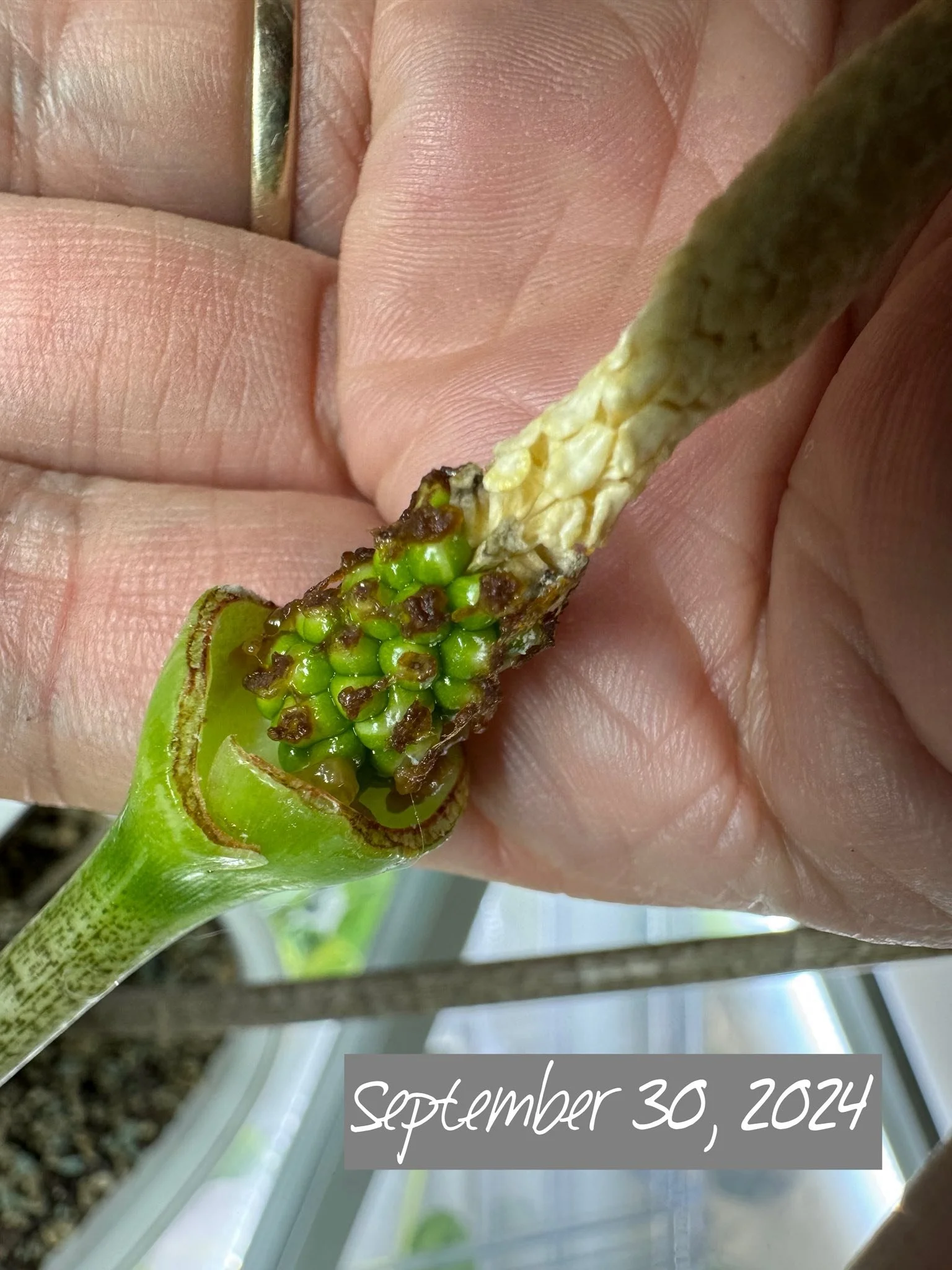 HYBRIDIZER: Rodolfo Parulan Jr. of Somerset, UK crossed the two Alocasia parents in Sptember of 2024, harvesting berries in May of 2025 (see detailed timed photos below)