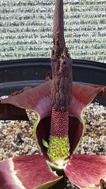 Spathe pedunculate, glabrous, convolute at the base, enlarged in the upper part, erect, obtuse, margin subrevolute, blackish-purple. Spadix with an oblong-clavate naked apex (appendix). Ovaries numerous. Abortive flowers (neuter organs) none. Stamens very numerous, sessile, opening by two apical pores.