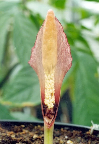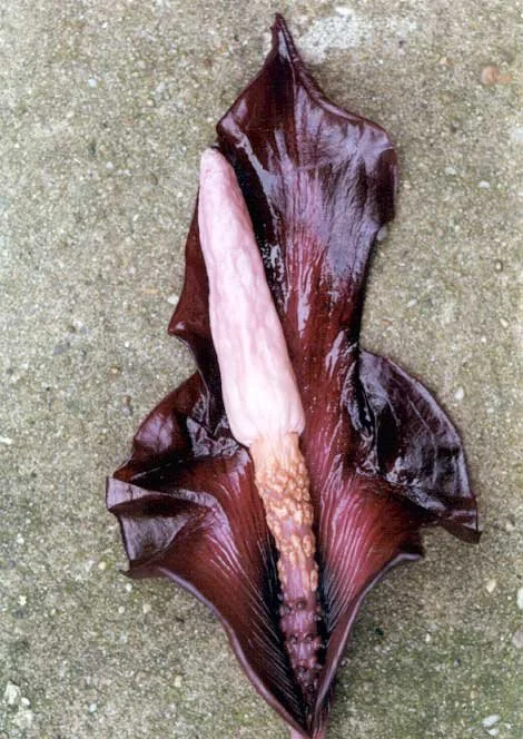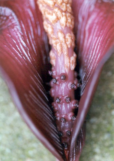 Spadix equalling the spathe, 6 cm long, subsessile; female zone ± cylindric, c. 0.8 cm long, c. 0.7 cm in diam., flowers lax and irregularly placed, leaving large parts of the axis visible; male zone cylindric, c. 1.7 cm long, 0.5 cm in diam., flowers congested; appendix fusiform-conic, 3.8 cm long, 0.8 cm in diam., obtuse, with scattered irregular shallow depressions, base slightly constricted, surface smooth, moderately glossy, pale brown with a yellowish flush, producing a foul smell. Ovaries slightly or clearly depressed, 1.5-2 mm in diam., c. 1 mm high, subcircular in cross section, blackish purple, 2- or 3-locular; style 0.1-0.2 mm long, c. 1 mm in diam., blackish purple; stigma large, slightly depressed, subcircular in cross section, 1-1.5 mm in diam., c. 0.8 mm high, dark purple, mostly with 2 or 3 elongate conic projections near the centre, these perpendicular to the stigma or variously pressed against it, surface otherwise verruculate. Male flowers consisting of 2 or 3 stamens, elongate diamondshaped, free or irregularly fused to form short longitudinal rows; stamens nearly entirely connate in one flower, c. 1 mm long, yellowish white; filaments 0.1-0.2 mm long, connate; anthers c. 0.8 mm long, the top slightly raised around the pores, these rounded or slighdy elongate, apical. Pollen finely striate.