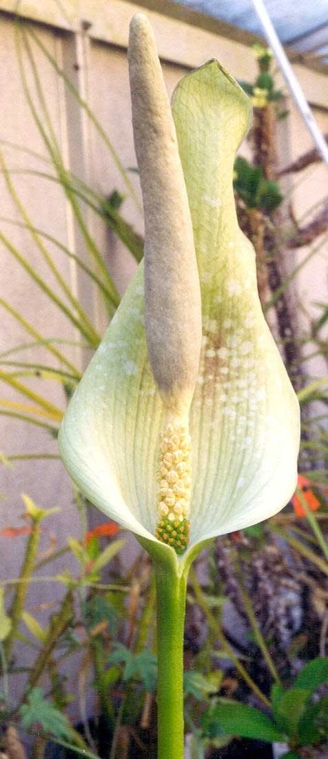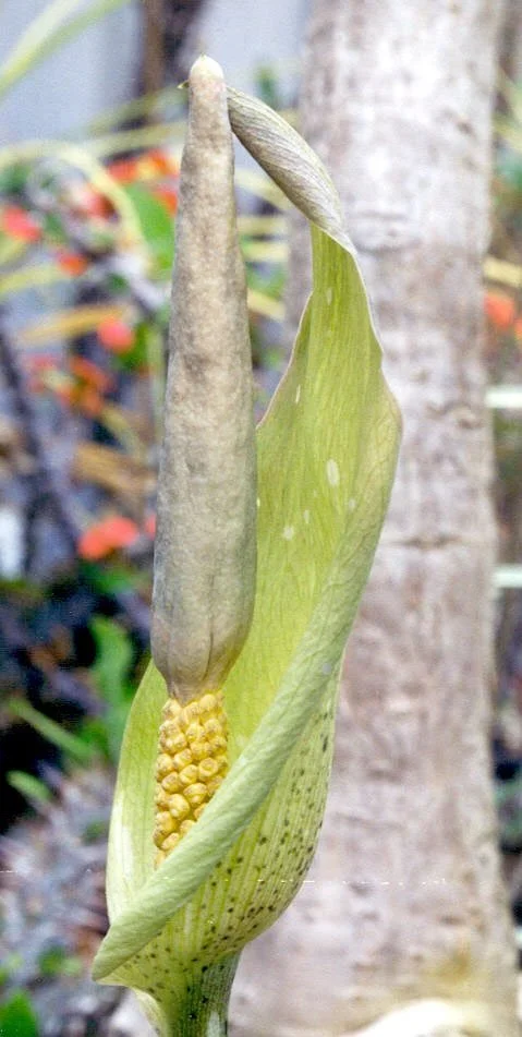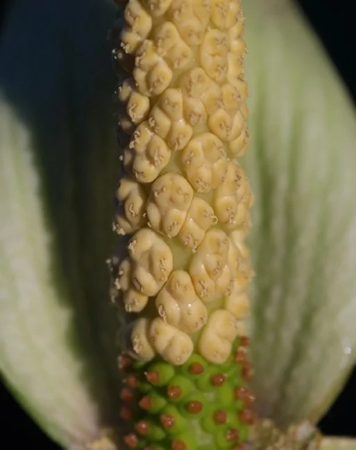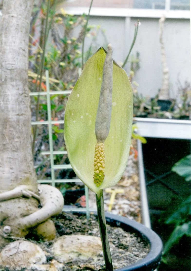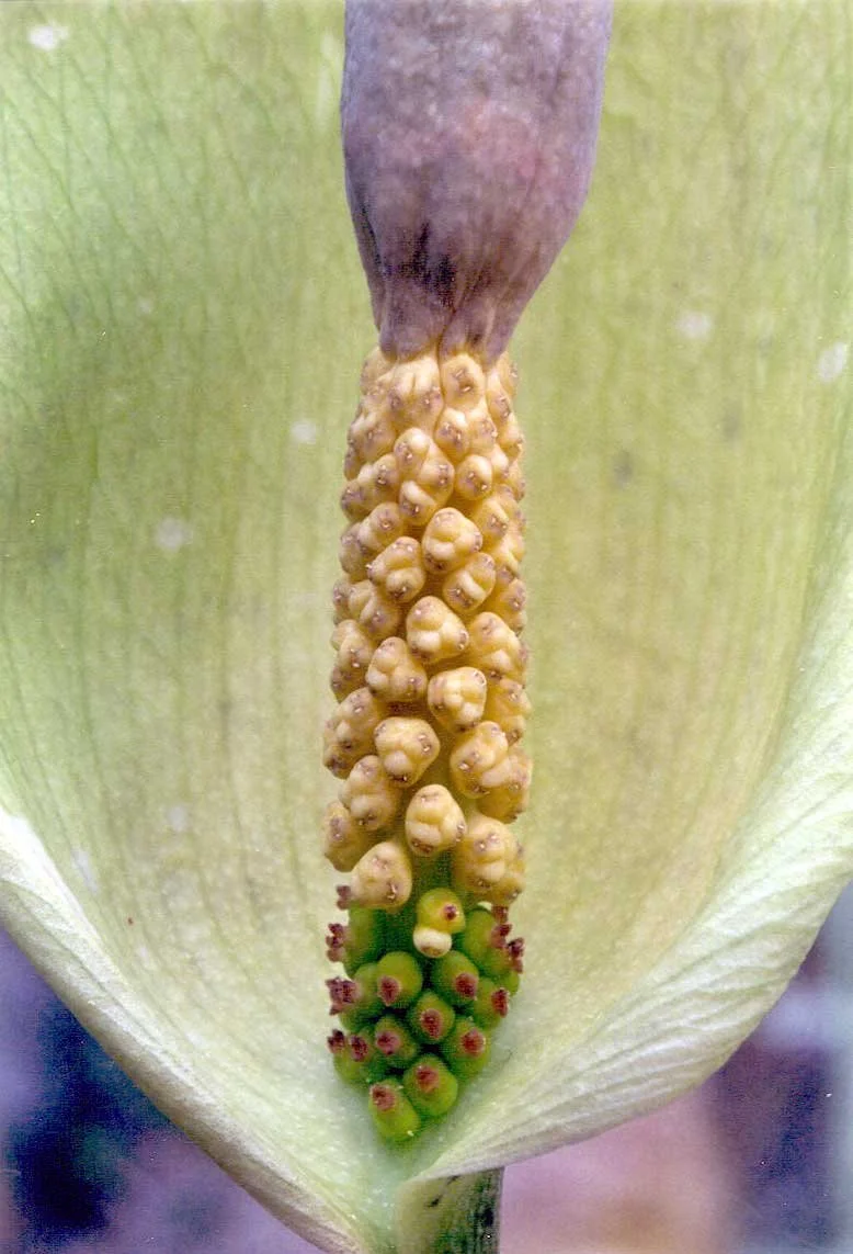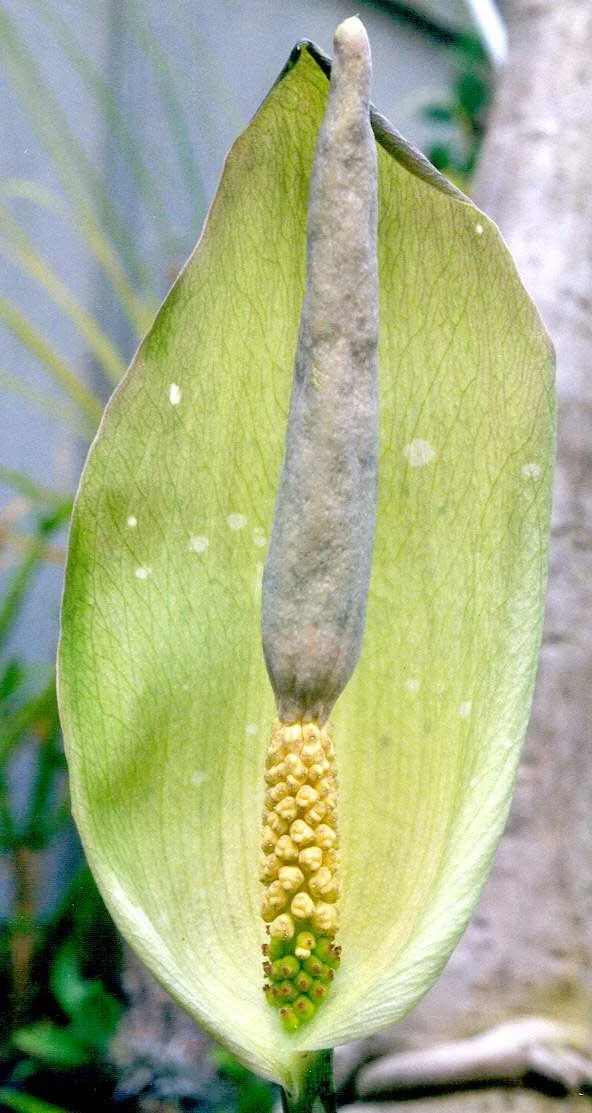 Inflorescence solitary, long peduncled; cataphylls up to 14 cm long; peduncle smooth, 36-43 cm long, c. 1 cm in diam. (base); spathe ovate-lanceolate to narrowly lanceolate, base shortly convolute, top acute, 10-14 cm long, 1.5-3 cm in diam., base inside smooth. Spadix slightly longer than the spathe, sessile, 13.5-17 cm long; female zone cylindric, c. 1 cm long, c. 0.5 cm in diam., flowers congested; male zone conic, 3-3.5 cm long, 0.6-0.8 cm in diam., flowers distant; appendix narrowly elongate-fusiform, smooth, acute, 10-13 cm long, c. 1 cm in diam. Ovaries (depressed?-)globose, diamond-shaped in cross section, c. 2 mm in diam., 2 mm high, 2-locular; stigma sessile, flattened, circular, c. 1 mm in diam. Male flowers consisting of (2) 3 or 4 (5) stamens; stamens 2.5-3 mm long;filaments entirely fused into a slender column, only the uppermost part free and spreading; column 1.5-2 mm long but in the uppermost flowers shorter to nearly absent, 0.6-1 mm in diam., base broadened; anthers at the top of the column, spreading, subglobose, 1 mm long, 1-1.5 mm in diam.; pores apical to subapical, elongate. Pollen striate.