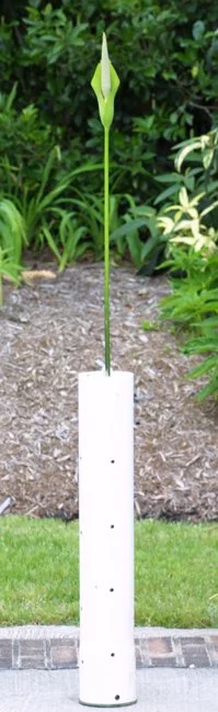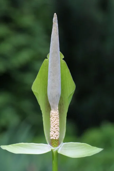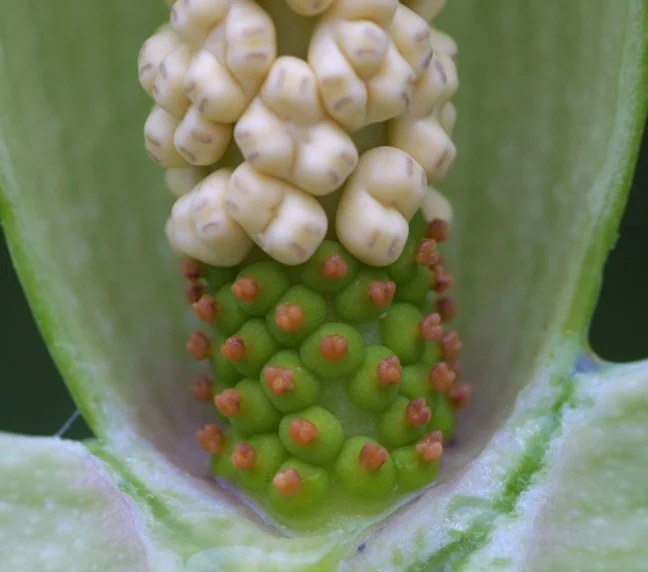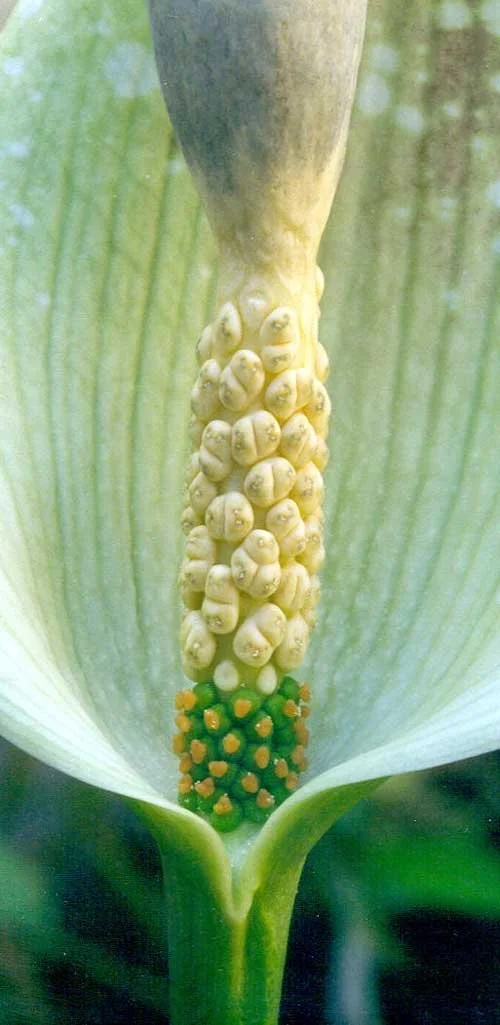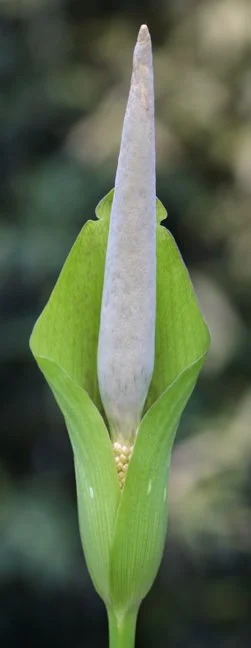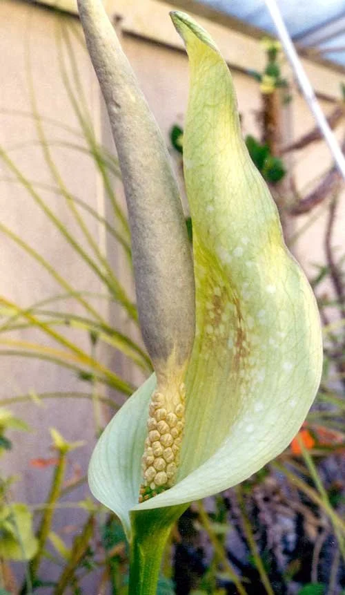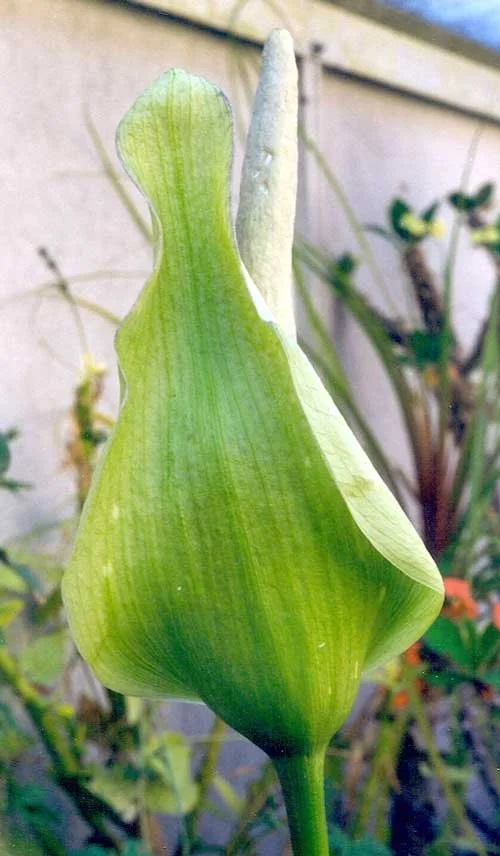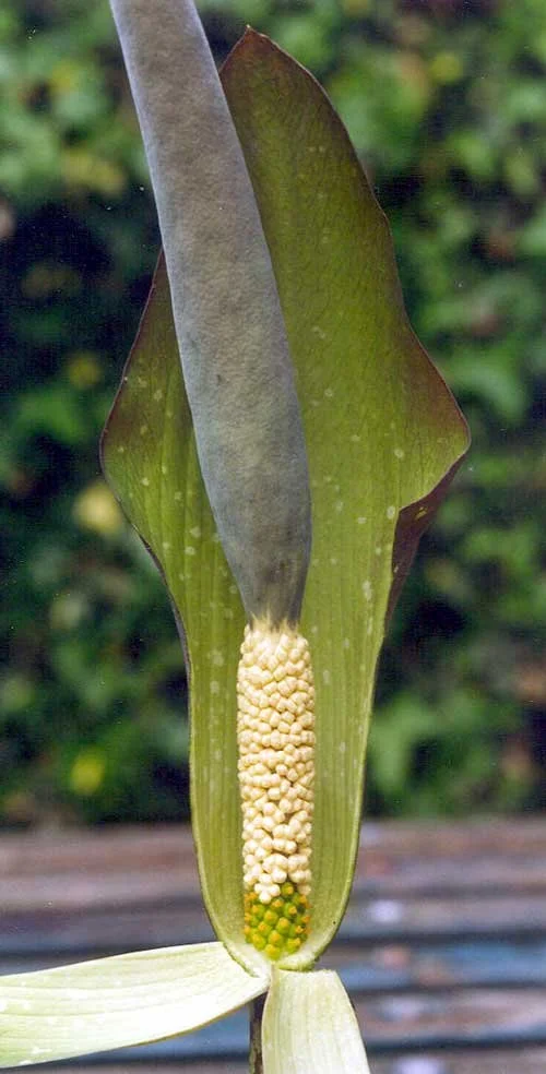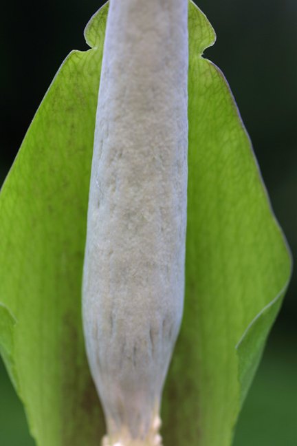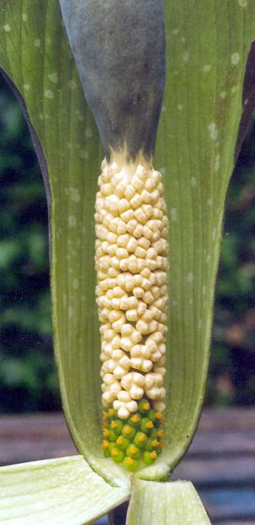 Inflorescence solitary, long peduncled; cataphylls up to 14 cm long; peduncle smooth, 36-43 cm long, c. 1 cm in diam. (base); spathe ovate-lanceolate to narrowly lanceolate, base shortly convolute, top acute, 10-14 cm long, 1.5-3 cm in diam., base inside smooth. Spadix slightly longer than the spathe, sessile, 13.5-17 cm long; female zone cylindric, c. 1 cm long, c. 0.5 cm in diam., flowers congested; male zone conic, 3-3.5 cm long, 0.6-0.8 cm in diam., flowers distant; appendix narrowly elongate-fusiform, smooth, acute, 10-13 cm long, c. 1 cm in diam. Ovaries (depressed?-)globose, diamond-shaped in cross section, c. 2 mm in diam., 2 mm high, 2-locular; stigma sessile, flattened, circular, c. 1 mm in diam. Male flowers consisting of (2) 3 or 4 (5) stamens; stamens 2.5-3 mm long;filaments entirely fused into a slender column, only the uppermost part free and spreading; column 1.5-2 mm long but in the uppermost flowers shorter to nearly absent, 0.6-1 mm in diam., base broadened; anthers at the top of the column, spreading, subglobose, 1 mm long, 1-1.5 mm in diam.; pores apical to subapical, elongate. Pollen striate.
