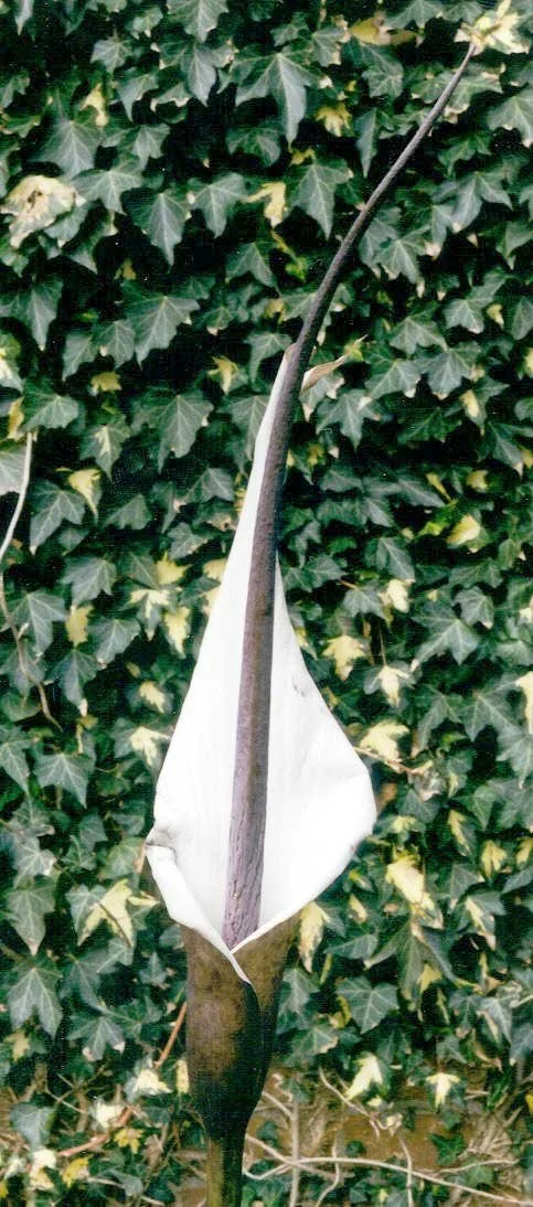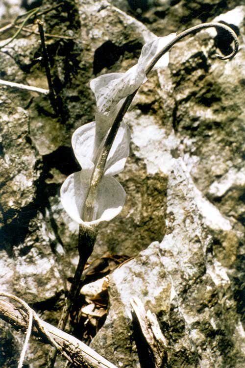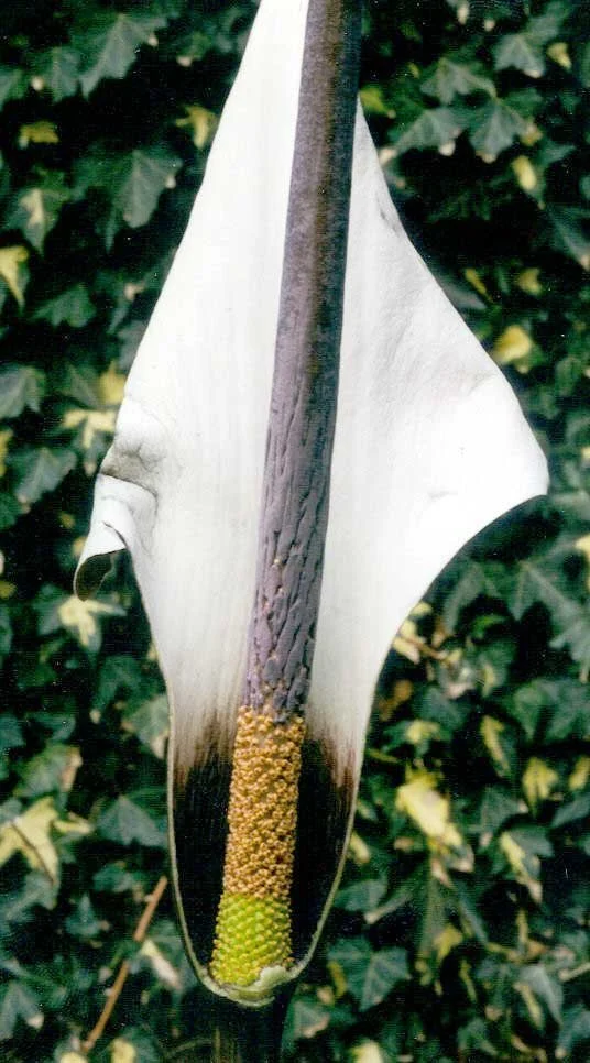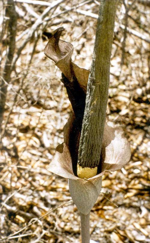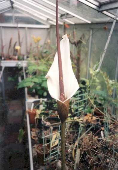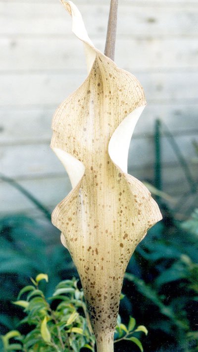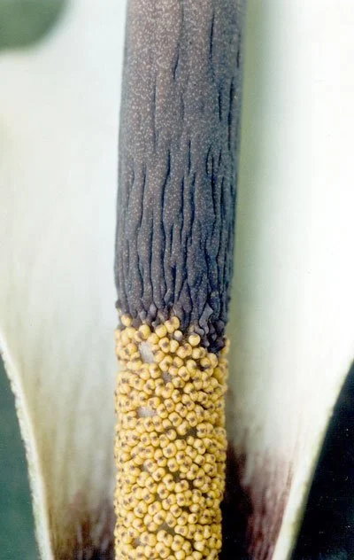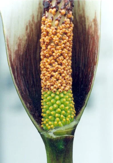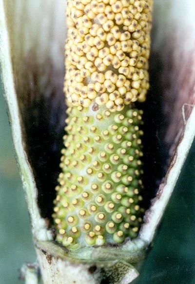 Inflorescence developing with the leaf or slightly earlier, erect. Peduncle 30–75 cm long and 1–2.5 cm in diam., coloured as petiole. Spathe erect, elongate triangular, 16–35 cm long, 10–14 cm in diam., apex acute, base rounded, margins often strongly revolute, limb and base not separated by a constriction, limb slightly or strongly twisted lengthwise, margin strongly undulate, base tubular, ovoid or cylindric, outside glossy dark or pale olive green to olive brown, with scattered, rounded, reddish brown spots and pale brownish veins, inside brownish purple at the base, above white with a faint purplish flush, verrucate, verrucae upwards chained to form long branching ridges, limb outside glossy olive brown or pale olive brown, with scattered, rounded, reddish brown spots and pale brownish veins, inside white, sometimes with a faint purplish flush at the centre, or all purple. Spadix sessile, longer than spathe, 28–40 cm long; female zone slightly obconic, 1–2.5 cm long, 1.1–1.8 cm in diam. at the base, flowers congested or slightly distant; male zone cylindric, 2.5–4 cm long, 1–1.6 cm in diam., flowers slightly distant, in distinct spirals, upwards more distant and gradually merging into a zone with irregular staminoides; appendix (incl. staminodial region) 23–35 cm long, 0.9–1.8 cm in diam., elongate conic, gradually tapering to the (sub)acute apex, brown or purplish brown, with a distinct waxy layer, producing a suffocating spicy odour or one reminiscent of cacao and oozing droplets of a clear fluid, the basal region containing deformed male flowers, showing all stages from normal flowers to papillate staminodes, the latter upwards merging to form broad ridges, leaving deep fissures in between, still higher up the ridges merge and form the outer wall of the appendix. Ovaries ovoid-pyriform or globose, 2–2.5 mm in diam., ca. 2.5 mm high, bright pale green, the apical region sometimes purplish, unilocular (pseudomonomerous); style absent or almost absent (to ca. 0.3 mm long); stigma slightly depressed, ovate or subtriangular in cross-section, shallowly 2- or 3-lobed, 0.5–1.2 mm in diam., 0.5–1 mm high, lobes obtuse, surface yellow, densely papillate. Male flowers consisting of 2–4 stamens; stamens ca. 2 mm long; filaments absent; anther obtuse, ca. 1.5–2 mm long, ca. 1.5–2 mm in diam., orange, connective and base of anthers reddish purple, pores apical, elongate. Pollen inaperturate, exine psilate, shed on the third day of flowering. Infructescence with spathe remains; fruiting part cylindric, 12 cm long, 2.5 cm in diam.; berries reddish, 0.7–0.9 cm long, 0.5–0.7 cm in diam.; seeds ovoid, 0.5–0.7 cm long, 0.4–0.5 cm in diam. Chromosomes: 2n = 26.