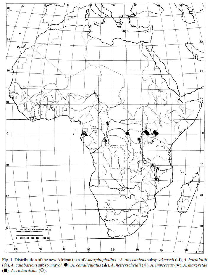Amorphophallus barthlottii is one of the smallest species in the genus and certainly the smallest of the African species. It was erroneously identified as Amorphophallus staudtii (Engl.) N.E. Br. by Barthlott & Bogner (1981). Amorphophallus barthlottii belongs to a group of species with a limited distribution in the very humid part of Liberia and the Ivory Coast. It has to be placed into the large African section with hairlike emergences at the base of the spathe tube, and is similar to Amorphophallus johnsonii, Amorphophallus calabaricus, Amorphophallus zenkeri and Amorphophallus staudtii.