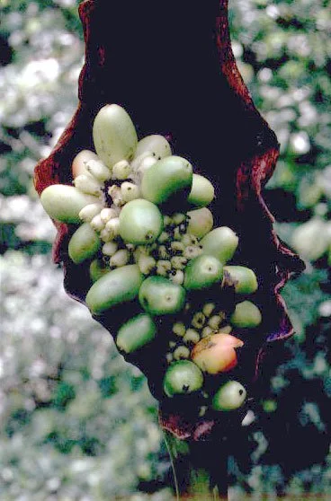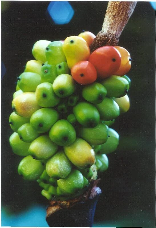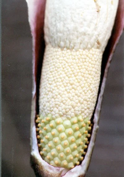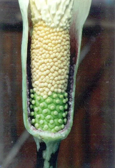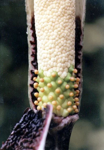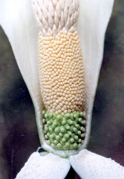 Spatha oblong and obtuse, convolute at the base, enclosing the inflorescence; shorter but much thicker than the spadix, which is sessile. Spadix is slightly longer than its own width (3× as long), tapering slightly toward the apex. The female zone is subequal in length to the male zone. Appendix thick, gradually narrowing toward the apex. Ovaries depressed-globose and unilocular.