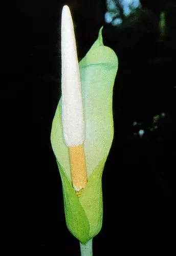 Inflorescence with peduncle cylindric, smooth, 30-75 cm high, 1-1.6 cm diam. at base, gradually narrowed to the tip; identical with petiole in colour and pattern of mottles; spathe ovateoblong, 12-22 cm long, differentiatedinto a basal convolute tube and an upper expanded limb with a shallow constriction in between, tip shortly acuminate, 2.5-3.5 cm diam. at convolute base, 2-3 cm diam. at the constriction, and 3-3.5 cm diam. just above the constriction. Spadix stipitate, 9-18 cm long; stipe to 0.5-1 cm long, 0.5-0.6 cm diam., light greenish; basal portion of 2-3.5 cm of the spadix occupied with pistillate flowers, middle 1-1.5 cm with neuter flowers, upper 3-3.5 cm with staminate flowers, and terminal 4.5-10 cm produced into a sterile cylindric barren appendix; a barren naked zone of 0.2-0.3 cm present between the zones with pistillate and with neuter flowers, respecitvely. Pistillate flowers subspirally arranged; ovary sessile, subglobose, 0.18-0.2 cm high, 0.2-0.3 cm diam., greenish, 2- or 3-loculed, each locule with one subbasal ovule; unicellular trichomes present on funicle and on placenta around the area of funicular attachment; style very short, cylindric, 0.5-0.8 mm long, 0.8-1 mm diam.; stigma 2- or 3-lobed, covered with short unicellularpapillae, cream-coloured, brownish on ageing; neuter flowers in 1-3 rows, creamy white in colour, obovoid, 0.2-0.3 cm diam., few appear to be transitional to the staminate flowers. Staminateflowers closely arranged, each composed of2-5 stamens borne on a white cushion-like tissue of 0.8-1 mm thickness; each stamen 0.1-0.13 cm high, inconspicuously 2-lobed; thecae dehisce by narrow apical horizontal slits; spadix-appendix cylindric, 4.5-10 cm long, 0.8-1 cm diam., rounded at apex, cream in colour, smooth except rarely at the base where it may bear some very shallow rhomboidally oriented projections; becomes warty on ageing; infructescence not observed.