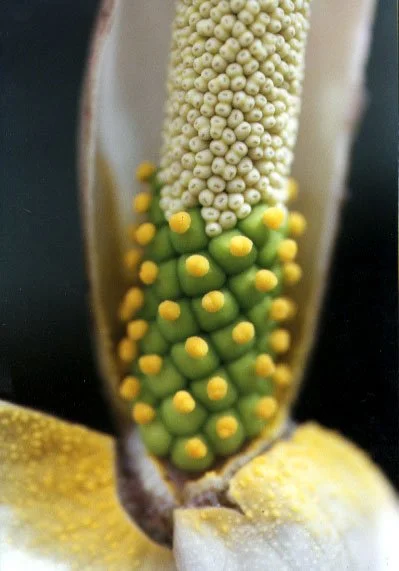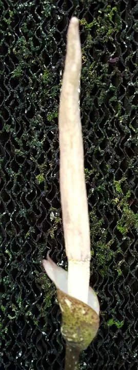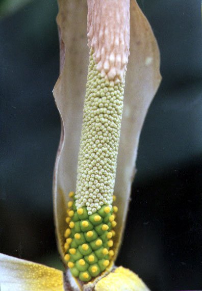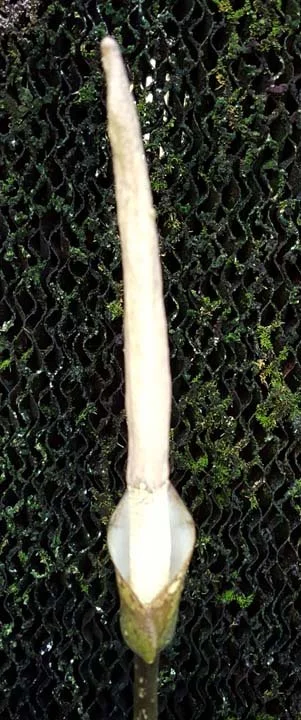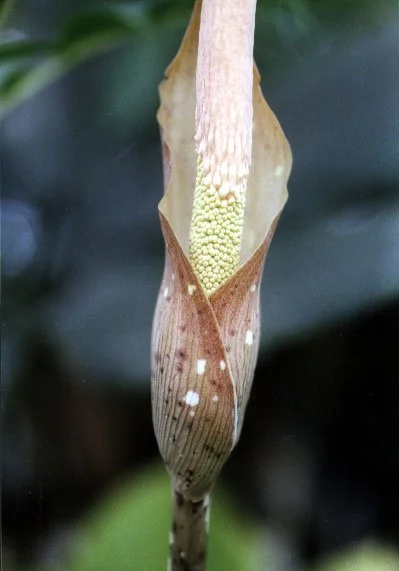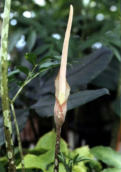 Inflorescence solitary, long peduncled; peduncle 25-30 cm long, 1 cm diam., as petiole; spathe elongate triangular, 11-12 cm long, 5-6 cm diam., acute, a very shallow constriction on the dorsal side, base convolute, outside background pale green or dirty greyish green, with scattered or nearly entirely covered by dark to mid-brown spots, often confluent, large and tiny, in between with or without a few scattered irregular pale green spots, inside whitish with a green flush, near the top with tiny purplish dots and a few veins purplish, base pale yellow or dark orangish yellow, with numerous shallow verrucae, especially on the dorsal side. Spadix sessile, longer than spathe, 20-28 cm long; female zone cylindric, 1.5-2.5 cm long, 1.2—1.3 cm diam., flowers congested; male zone cylindric, 3.5-5 cm long, 0.9-1.2 cm diam., terete or slightly laterally compressed, flowers congested; appendix 14-20 cm long, to 1.3 cm diam., elongate conic, narrow, terete or laterally compressed, base or lower half with short, shallow ridges, sometimes accompanied by shallow conical staminodes, upper halfsmooth, apex subacute, surface dirty pale yellowish brown or dirty creamish. Ovaries depressed, prismatic, 4 mm diam., 2 mm high, bright green, bilocular; style short or very short, curved upwards or nearly straight, 0.3-1 mm long, 0.8 mm diam., bright green; stigma slightly depressed, 2 mm diam., 1.5 mm high, shallowly bi- or trilobed, lobes slightly hemispheric, obtuse, surface yellowish, verruculate. Maleflowers consisting of 3 or 4 stamens; stamens c. 2 mm long, filaments c. 0.8 mm long, fused only at the base, offwhite; anthers c. 1.2 mm long, c. 1 by 2 mm diam., rectangular, off-white; pores apical, elongate, connective flat or sunken, dirty greyish green turning creamish; pollen striate (muri rather coarse and irregular), ellipsoidal (length/breadth 1.36), 50 pm long.