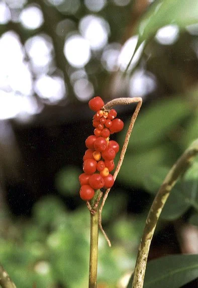 Fruiting part of infructescence 7 cm long, 2 cm diam., cylindric; berries subglobose, 0.8 cm long, 0.8-1 cm diam., bright red, 1- or 2-seeded; seeds subhemispheric, to 0.8 mm diam., and 0.6 mm thick, greyish black, with whitish dots, raphe short, irregular.