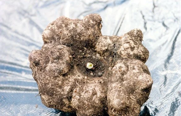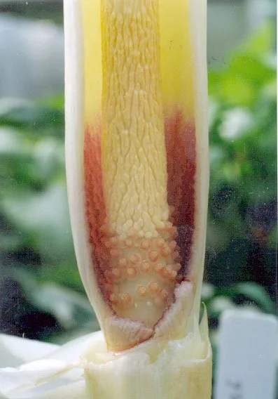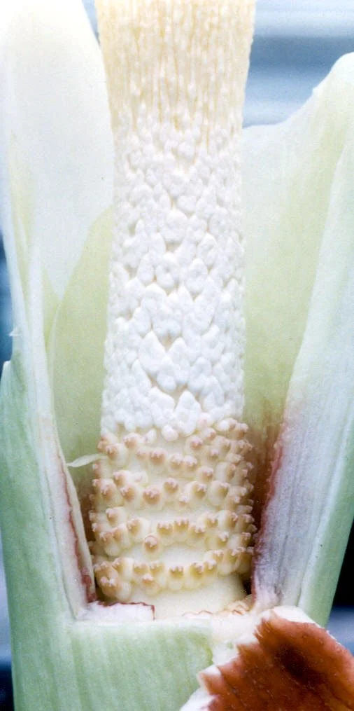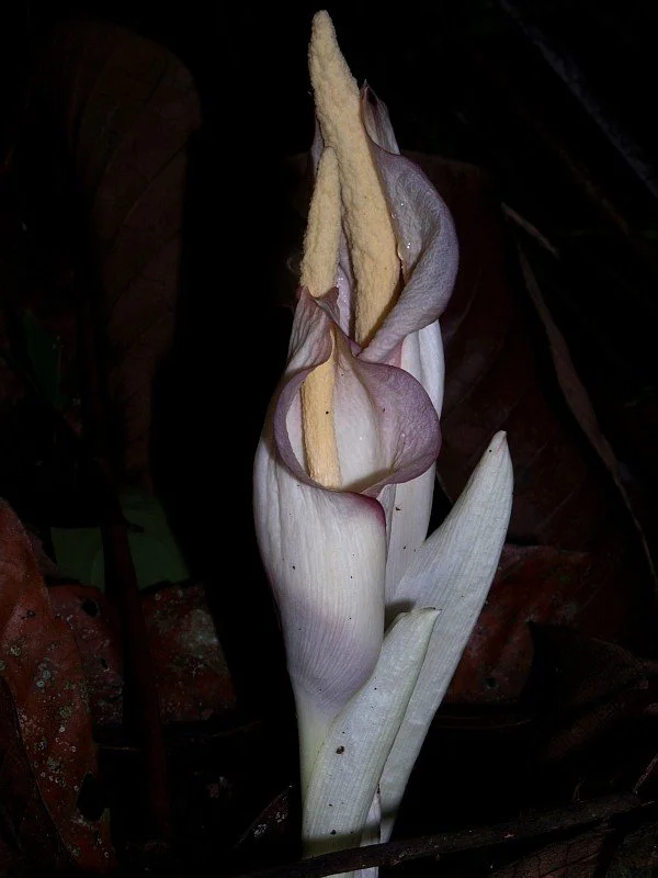 Inflorescence solitary, short peduncled; cataphylls off-white; peduncle 8-13 cm long, 1-2.2 cm diam., entirely subterranean, white with a faint greenish flush, smooth, very tightly enveloped by the cataphylls; spathe erect, suborbicular, often broader than long, 10-13.5 cm long, 11.5-16 cm diam., limb obliquely spreading at female anthesis, erect at male anthesis, base tubular, strongly convolute, largely hidden in cataphylls, outside spathe entirely off-white, inside similar but base reddish purple, base within with scattered small warts or coarsely grooved, grooves distinctly verruculate. Spadix longer than spathe, stipitate, 13.5-21 cm long; stipe massive, oblique, off-white, 0.6-1 cm long, 1.6 cm diam. (base); female zone 1.5-2.5 cm long, 1.5-2.3 cm diam., slightly conic, flowers in vertically separate, horizontal, sinuous chains; male zone conic, 3-4.5 cm long, 1.1-2.2 cm diam., flowers arranged as female flowers but chains closer together, or partly or entirely fused vertically, sometimes forming vertical chains; appendix fusiform, 8-14 cm long, 1.2-2.8 cm diam., slightly laterally compressed, subacute, yellowish white, surface rugulose and with narrow, shallow grooves, producing a strong smell of fried fish and oozing out droplets at female anthesis. Ovaries ovate or slightly depressed, 2-3 mm diam., 2.5-3 mm high, base off-white, top dirty reddish brown, unilocular, one basal ovule; style excentrically placed, consisting of three acute branches, two acroscopic small ones and one basiscopic longer one, pale dirty reddish brown, c. 1.5 mm diam., 0.3-0.8 mm long; stigma thin, c. 1.5 mm diam., c. 0.5 mm high, irregularly, shallowly lobed-sinusoid, surface very pale dirty brownish, verruculate. Maleflowers consisting of c. 3 stamens but pattern often obscured by lateral and vertical fusion of flowers; stamens c. 1 mm high, c. 1-2 mm diam., often fused with adjacent stamens,filaments c. 0.5 mm long, entirely connate; anthers c. 0.5 mm long, truncate, often entirely connate, ivory-white; pores apical, rounded, oval or variously elongate, often confluent with adjacent pores in various ways; pollen striate, ellipsoidal (length/breadth 1.15), 47 pm long, or fossulate to coarsely striate, spheroidal (length/breadth 1.09), 39 pm long.