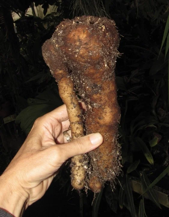 Tuber elongate, napiform, sometimes irregularly branched, 10–16 cm long, 4– 6 cm wide, dirty white. Leaf solitary; petiole 10–16 cm long, 0.75–1.25 cm in diam., smooth, green; lamina to 90 cm wide, the three rachises markedly inclined, barely winged, about as long as the petiole before again branching; leaflets several discrete on each rachis, elliptic, top acuminate, base broadly decurrent, 25–30 cm long, 10–12.7 cm wide, upper side glossy rich green, lower side paler.
