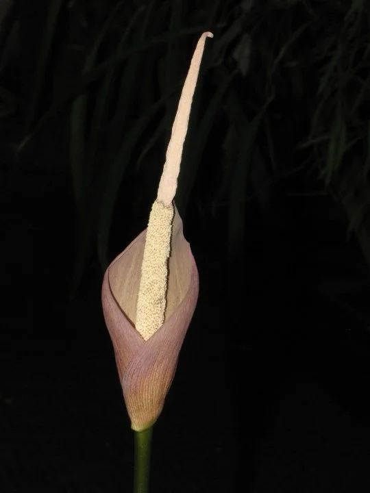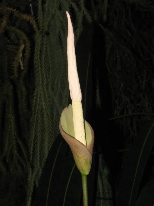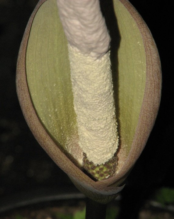 Inflorescence solitary, long pedunculate; peduncle smooth, dark grayish green to reddish gray, 10–17 cm long, 0.5 cm in diam.; spathe erect, triangular, base convolute, top acuminate, 6–8 cm long, 2.5–3.5 cm in diam., outside grayish green with darker venation, inside pale green to cream, inside base with shallow warts. Spadix longer than spathe, sessile, 10.5–14 cm long; female zone cylindric, 0.6–1 cm long, 0.8 cm in diam., flowers congested; male zone cylindric, 4– 4.25 cm long, 0.8 cm in diam., flowers congested; appendix narrowly conical, slightly constricted at the base, 5.5–8.5 cm long, 0.8 cm in diam. near the base, acute, smooth or shallowly rugulose, off-white. Ovaries obconical, angulate, depressed, upper part strongly truncate, ca. 1 mm high, ca. 1.5 mm in diam., pale green, unilocular; style very short, ca. 0.2 mm long, 0.5 mm in diam.; stigma disciform, circular in crosssection, slightly 3-lobed, shallowly grooved between lobes, verrucate, greenish-yellow. Male flowers consisting of 4–5 (–9) stamens; stamens ca. 1.2 mm long, creamywhite; filaments very short, ca. 0.2 mm, indistinctly connate with neighboring stamens; anthers truncate, 0.5–1 mm high, 1 mm in diam.; pore apical, slit-like, fusing to form a common large slit per theca at male anthesis; connective broad, truncate, ca. 0.6 mm wide.