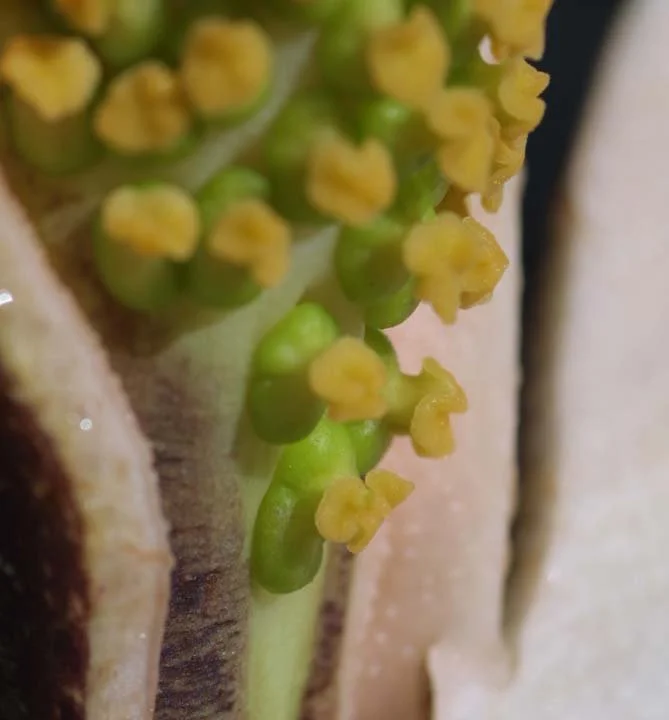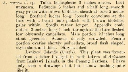 ETYMOLOGY: The species epithet, similar to Amorphophallus carnosus, is derived from the latin carnea/carneus which translates to flesh, likely referring in this case to the flesh-colored spathe of Amorphophallus carneus