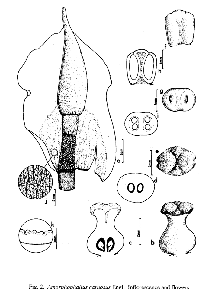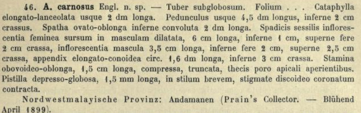 ETYMOLOGY: The species epithet share an origin with Amorphophallus carneus, both being derived from the latin carnea/carneus which in the case of Amorphophallus carnosus likely alludes to it being fleshy, thick, succulent (in mass/substance)
